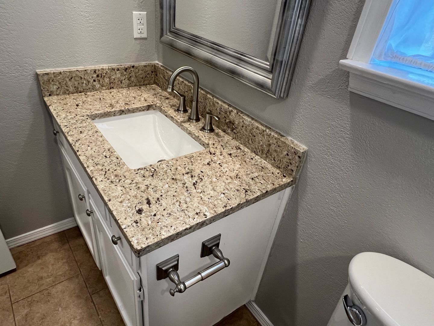Family room is centered by a black marble wood burning Fireplace, trimmed in tumbled granite.